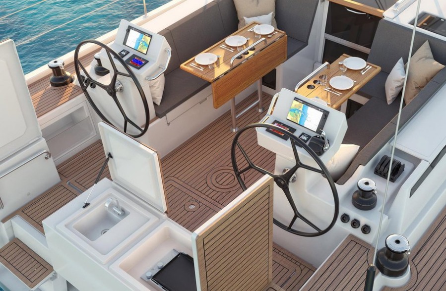 Fun meets security. Atokos offers excellent sailing performance on the one hand and safe sailing on the other. You can cut it and steer it from the two rudders to the rear cockpit, carefully adjust and cut the sails in each position using the four winches. The steering wheel also offers you a perfect view of all navigation equipment, sails and the way forward.